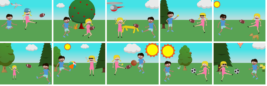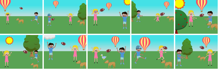 11. Mike and Jenny are playing catch with a football while a dog watches and a hot air balloon flies past them.