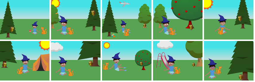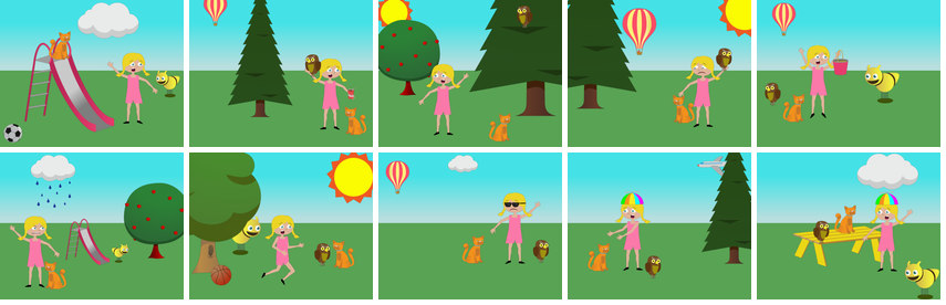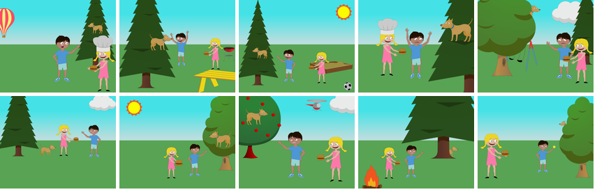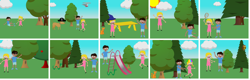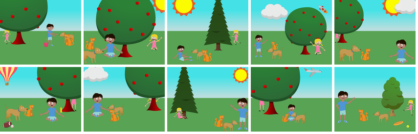 31. Mike is asking dog and cat where Jenny is. Look she is hiding behind the tree!