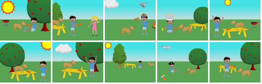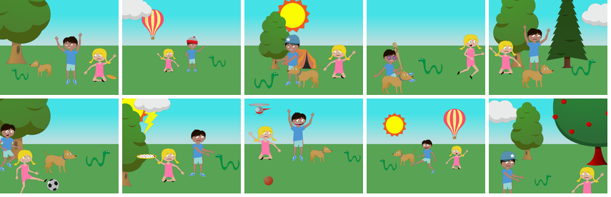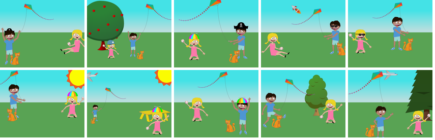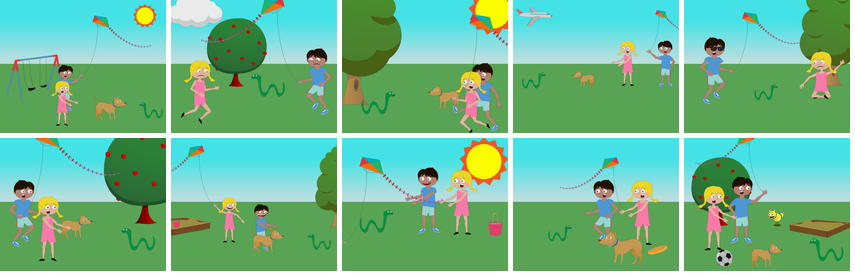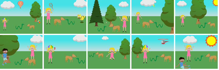 116. Mike and Jenny are surprised to see a green snake while they are at the park flying their kite. Dog thinks the snake looks funny!