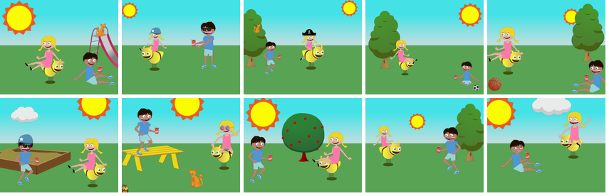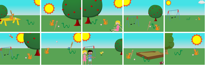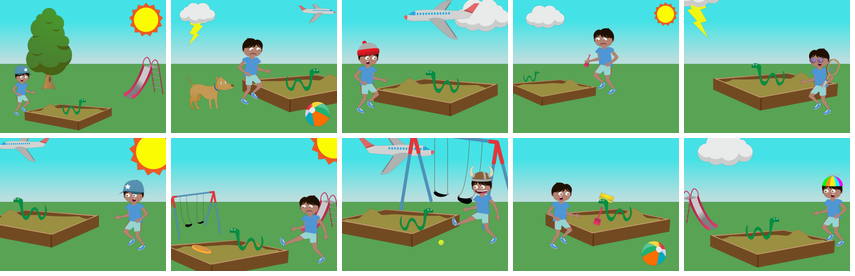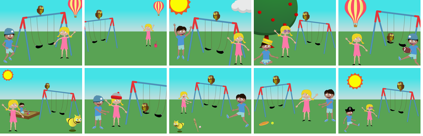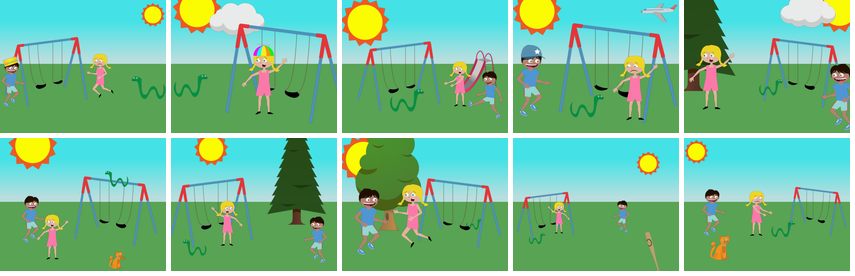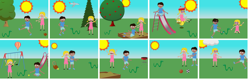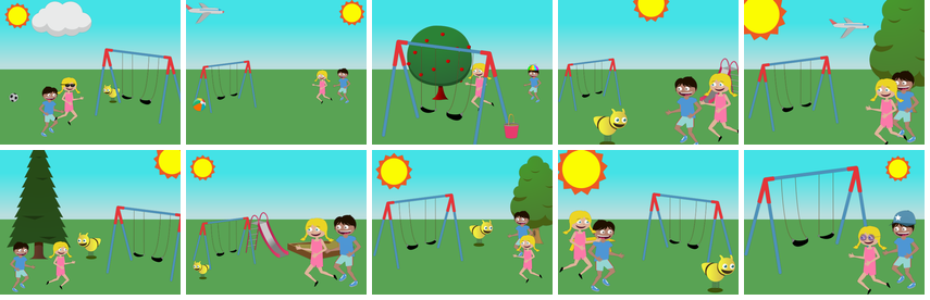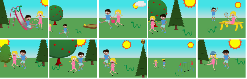108. Jenny gets off the swings because she notices a snake. Mike doesn't see the snake and is running towards the swing set.