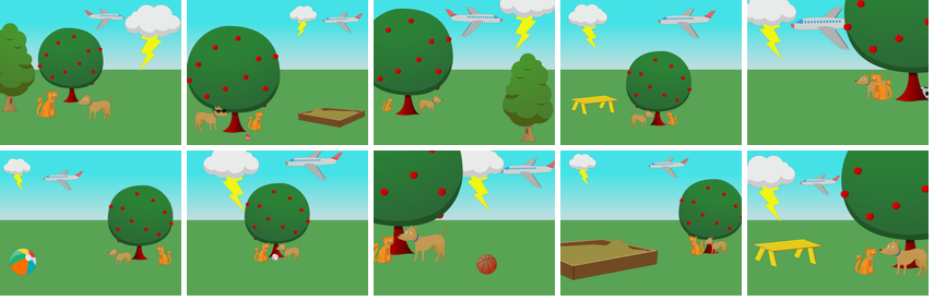 110. The airplane is headed right for the storm. The dog and cat wait under the apple tree.