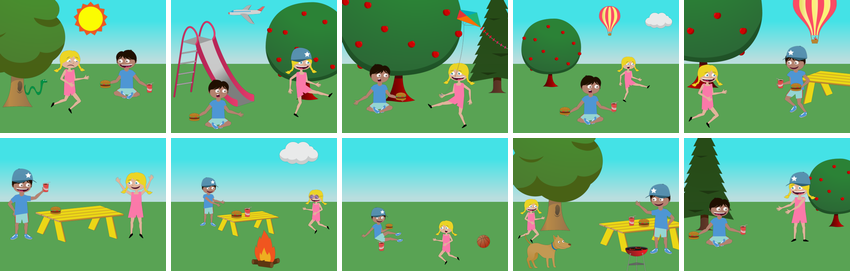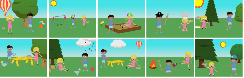 36. Mike and Jenny sit in the grass and laugh while they watch a cat try to slide down the slide.