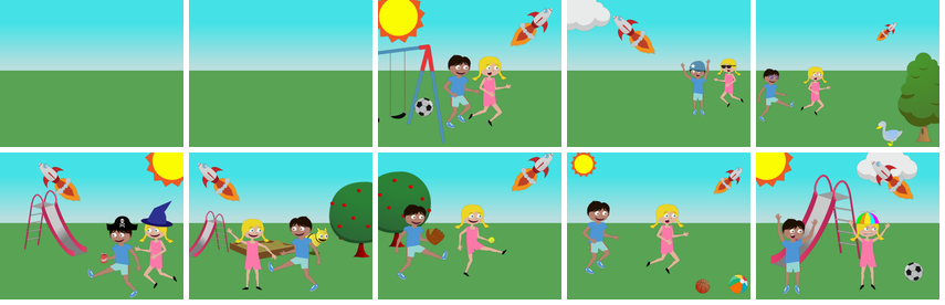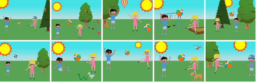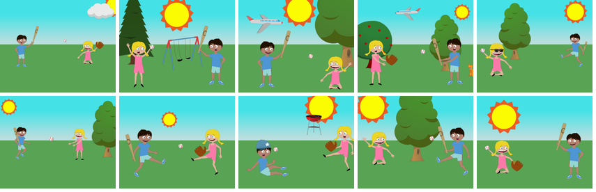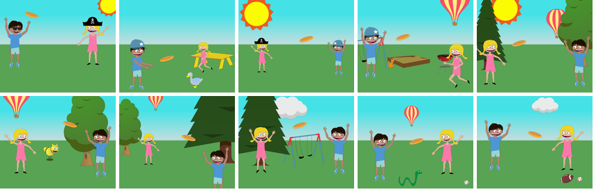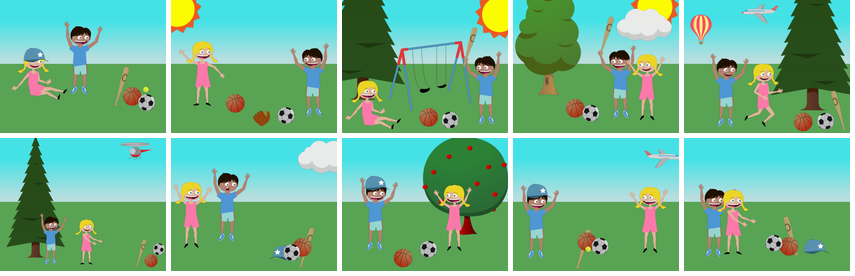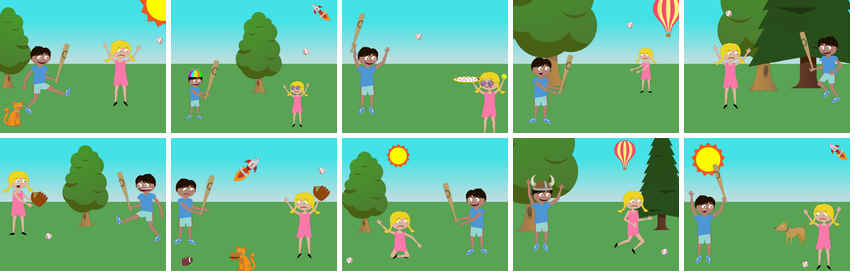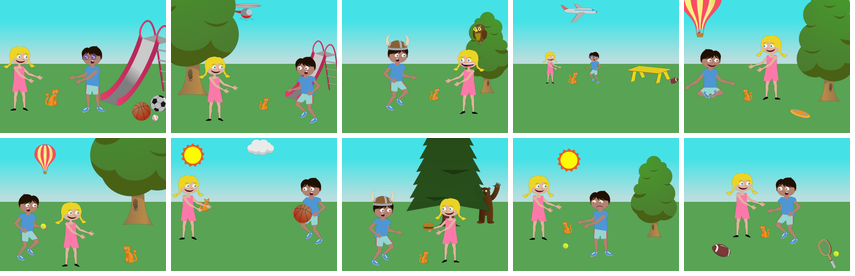 80. Mike and Jenny play catch in the park under a flying rocket ship and a tree with balloons.