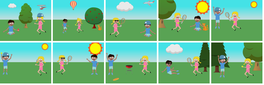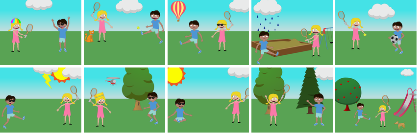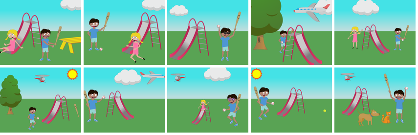 18. Mike is sliding down the red slide and Jenny is asking him if he wants to play tennis or baseball.