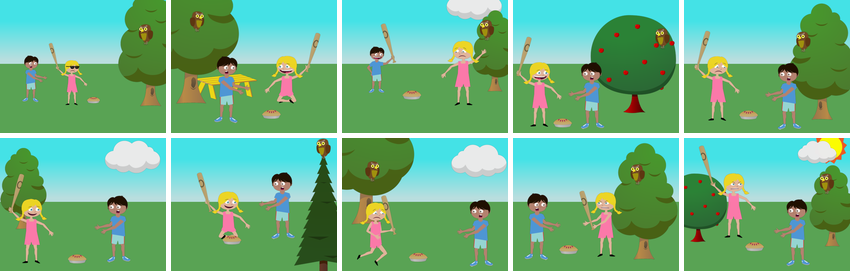 127. Mike pleads with Jenny who is about to hit a pie on the ground with a bat. An owl watches in a tree.