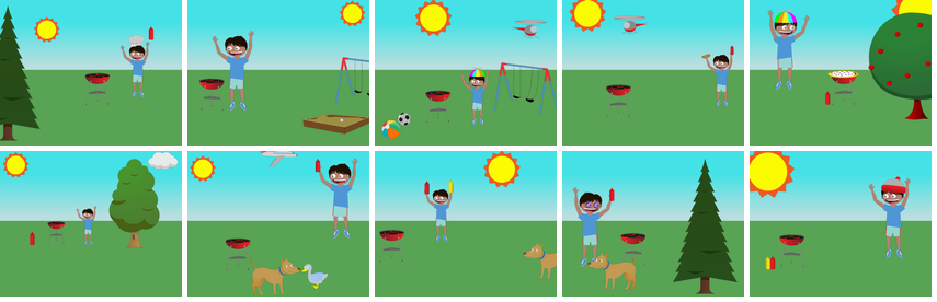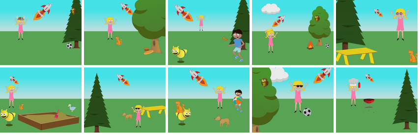 129. Jenny jumps in the air and tries to make the noisy rocket go away.