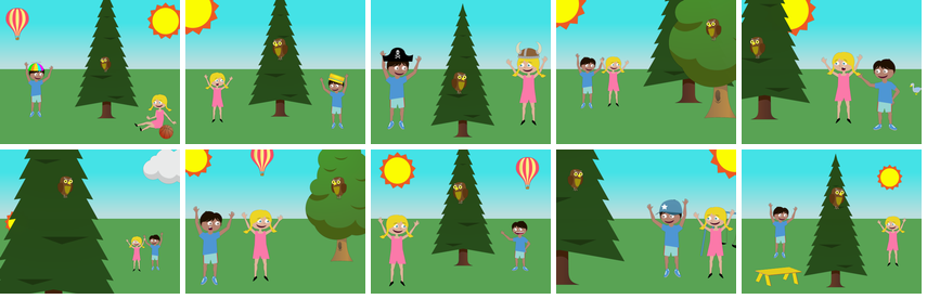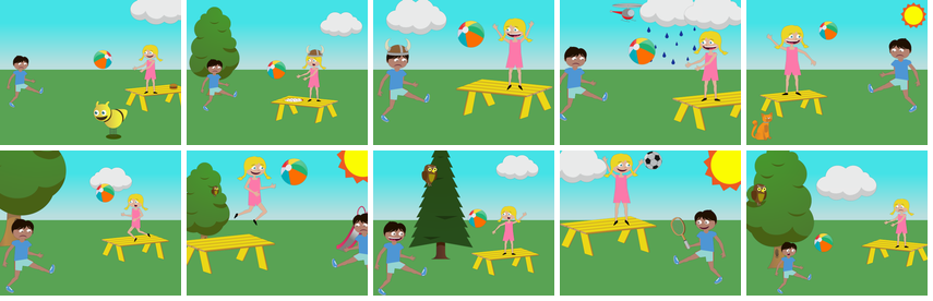 140. Mike and Jenny are kicking a beach ball towards a tree inhabited by an owl.