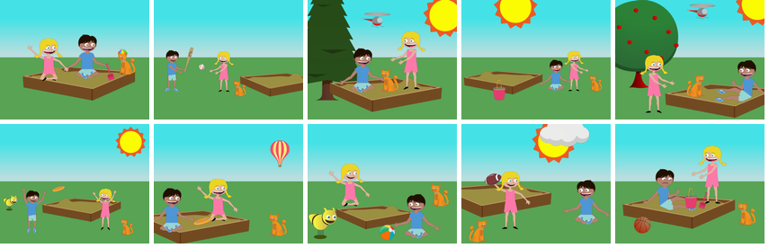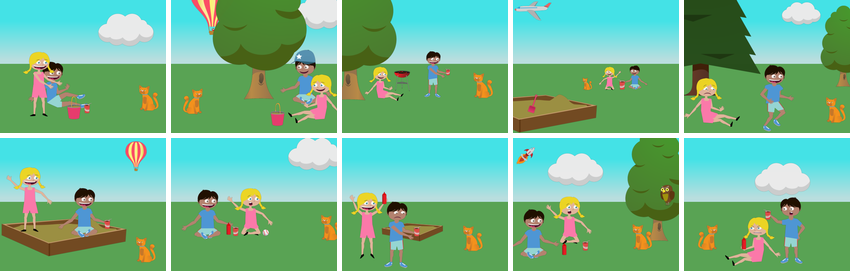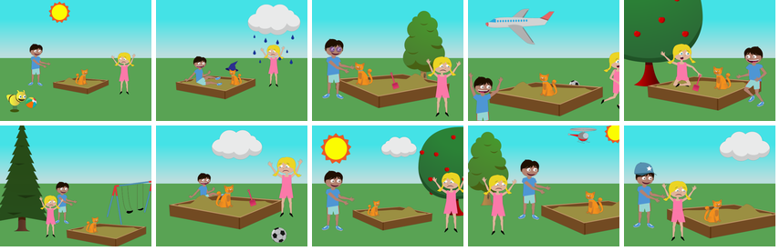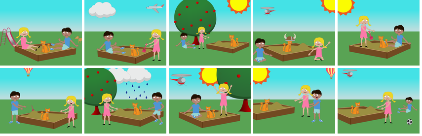 92. Mike and Jenny are sad because the silly cat will not get out of the sandbox.