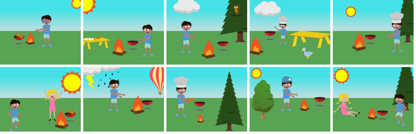 21. Mike is sad that the hot dogs are burning on the grill! Jenny is happy just to have the sandwich and pizza.
