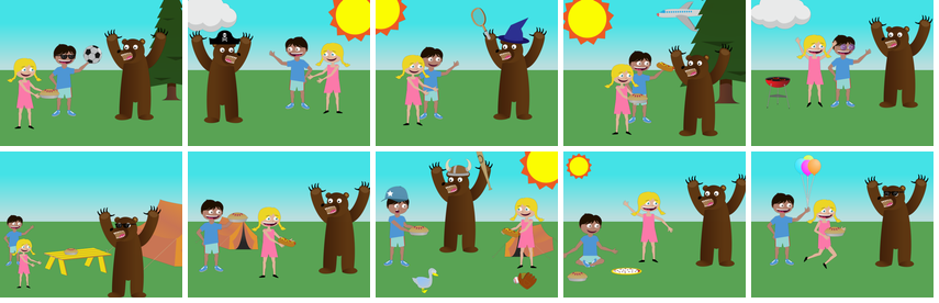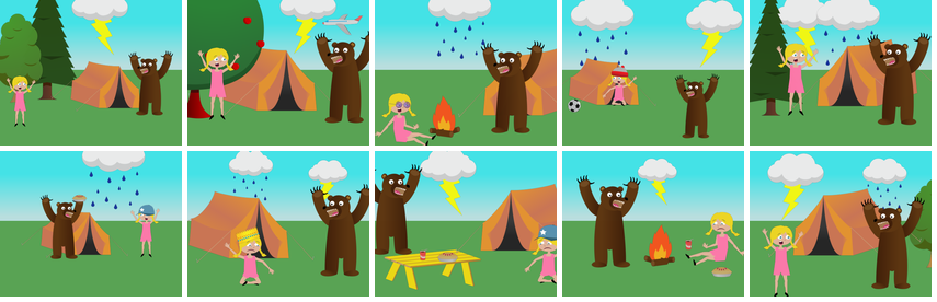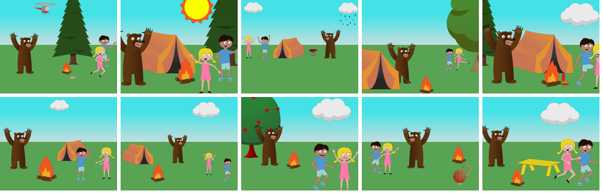 135. Mike and Jenny run away when a bear comes to take their pizza.