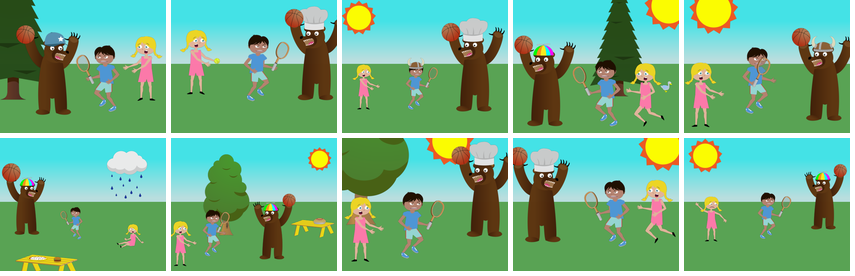 165. Jenny looks scared as Mike holds a tennis racket and angrily runs at a bear that is wearing a hat and holding a basketball.