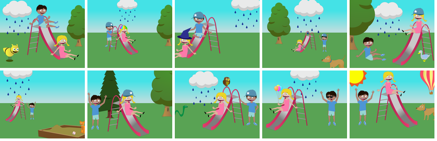 193. Mike happily waits his turn to go down the slide after Jenny even though it is raining in the park.