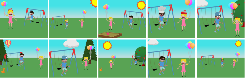 40. Mike jumps off the swing and runs to Jenny. Jenny has balloons to share with Mike.