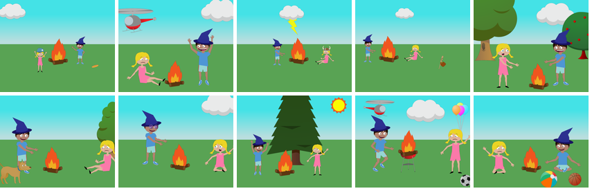 47. Mike is pretending to be a wizard and make a very big fire. Jenny is scared the fire will get too big.