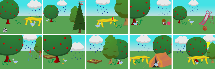70. It was raining in the park and a duck and a snake were trying to take shelter.