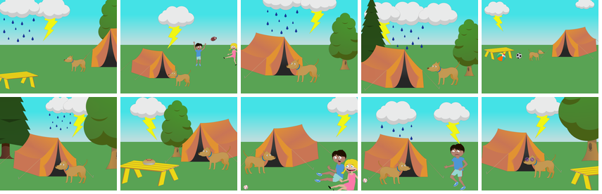 87. Dog is going in the tent when it starts to storm. Dog does like thunder and lightning!