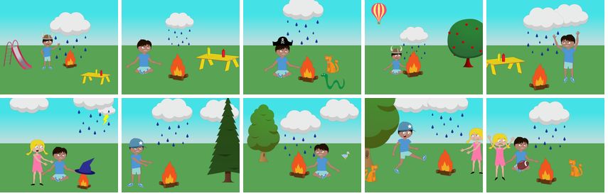 130. "Oh no!" shouts Jenny as it begins to rain! Mike is mad because the rain will make the fire go out!